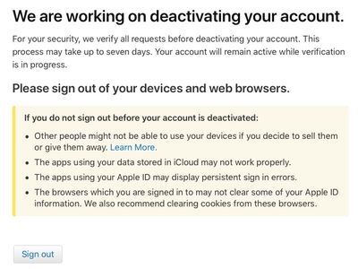 - Apple 將通過網站和電子郵件確認正在努力停用您的帳戶。蘋果表示,該過程可能需要長達 7 天的時間。在驗證過程中,您的帳戶將保持活動狀態。