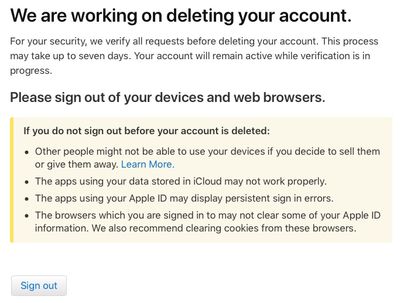 - Apple 將通過網站和電子郵件確認正在刪除您的帳戶。蘋果表示,該過程可能需要長達 7 天的時間。在驗證過程中,您的帳戶將保持活動狀態。