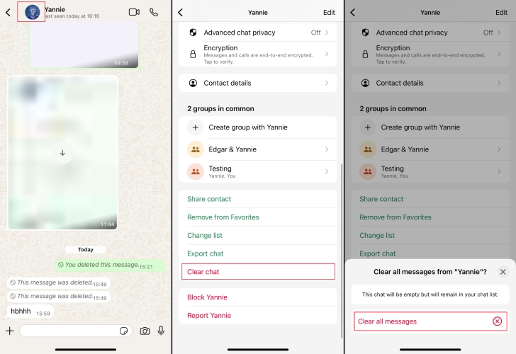 如果您不願意一一選擇刪除 WhatsApp 消息,您可以選擇清除單個 WhatsApp 個人或群組聊天或一次性清除所有 WhatsApp 聊天。清除聊天可以清除所有消息,但會將聊天線程保留在列表中。