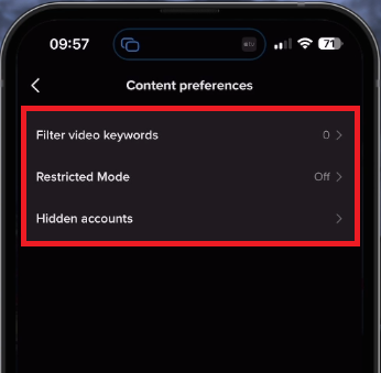 向下滾動並找到“內容首選項”。在這裡您將找到“受限模式”選項。通過切換此開關,您可以輕鬆禁用 TikTok 上的受限模式,從而為您提供更廣泛的內容。