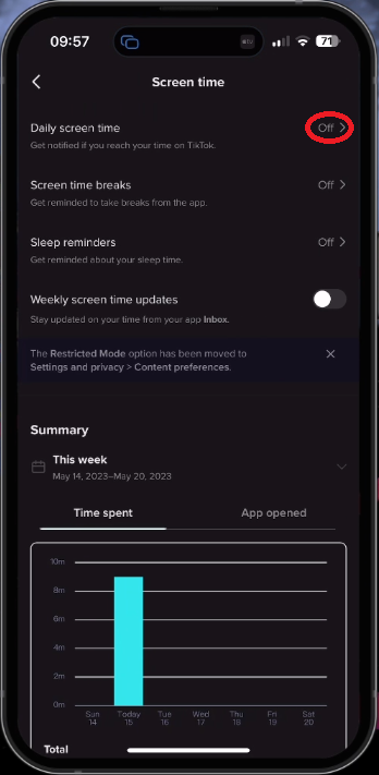 有時,如果您超過了分配的屏幕時間,您可能會發現對 TikTok 的訪問受到限制。要查看和修改此設置,請返回 TikTok 主設置並選擇“屏幕時間”。在這裡,您可以自由地衡量您的每日 TikTok 使用限制並根據您的喜好進行調整。