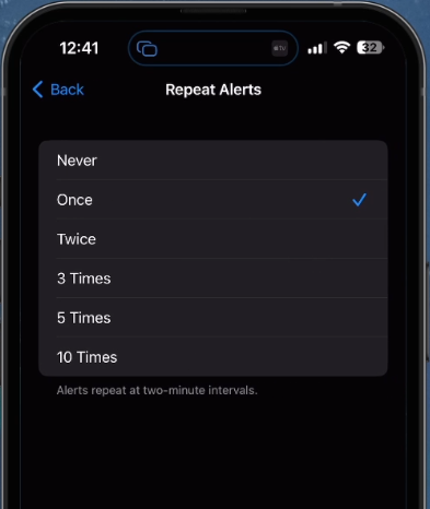 接下來,您將看到“重複警報”。您可以在此處修改警報的頻率。將默認選項從“兩次”更改為“一次”。此更改可確保對於您收到的每條新短信,您只會收到一次提醒。