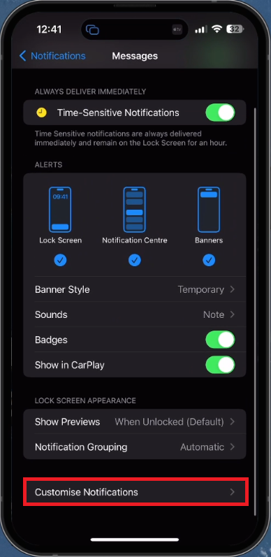在“消息”通知設置中,您將看到一個標題為“自定義通知”的選項。選擇那個。