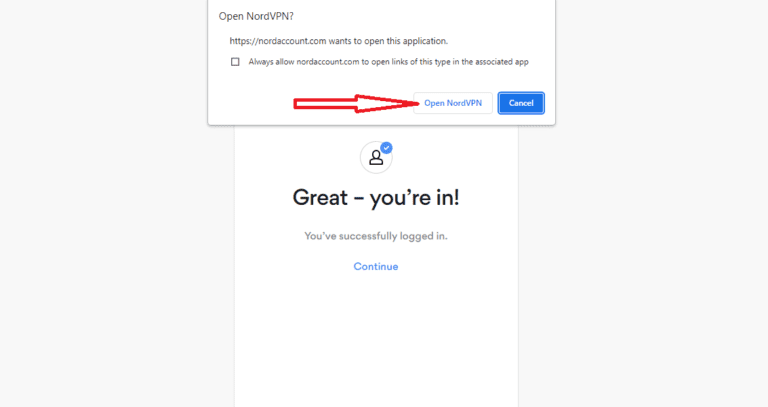 - 在彈出的窗口中,點擊“打開 NordVPN 應用程序”並選中該框“始終允許 Nordaccount.com 打開此類鏈接……”