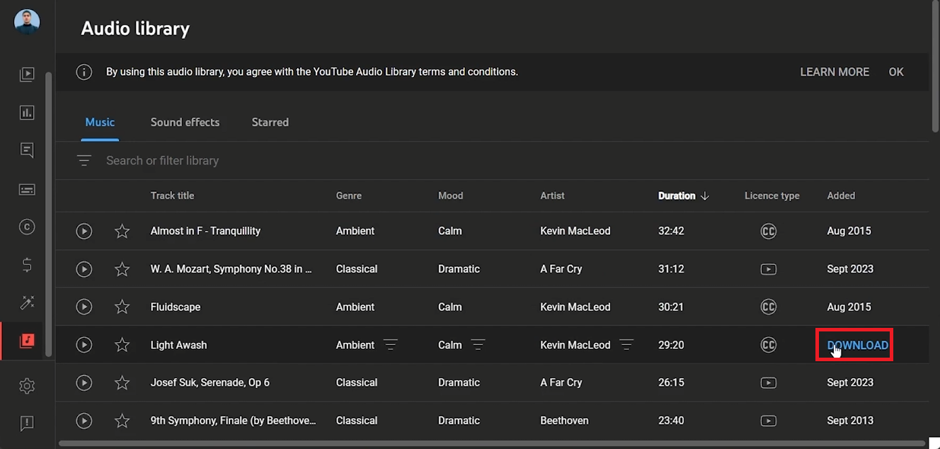 查找音頻庫:在 YouTube Studio 中,查看左側邊欄並點擊“音頻庫”。