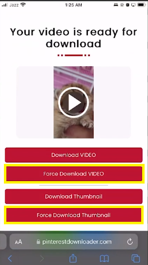 一旦您選擇的Pinterest視頻完成處理,菜單將提供多個下載選項。單擊“下載視頻”,瀏覽器的內置媒體播放器將啟動視頻播放。要加快該過程,請使用“強制下載視頻”選項直接提示視頻下載。