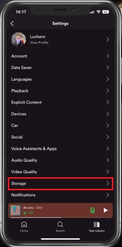 有時,如果您的設備存儲空間開始變滿,應用程序將不允許您下載其他歌曲。為了防止這種情況,請點擊屏幕左上角的個人資料圖片。從這裡導航至貯存。