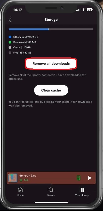 這將向您顯示您下載的歌曲在設備存儲空間中的使用量的概覽。要減少所需的總體大小,請繼續刪除所有下載。