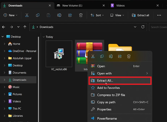 右鍵單擊 .zip 文件並選擇“全部解壓...”以選擇所需的位置。