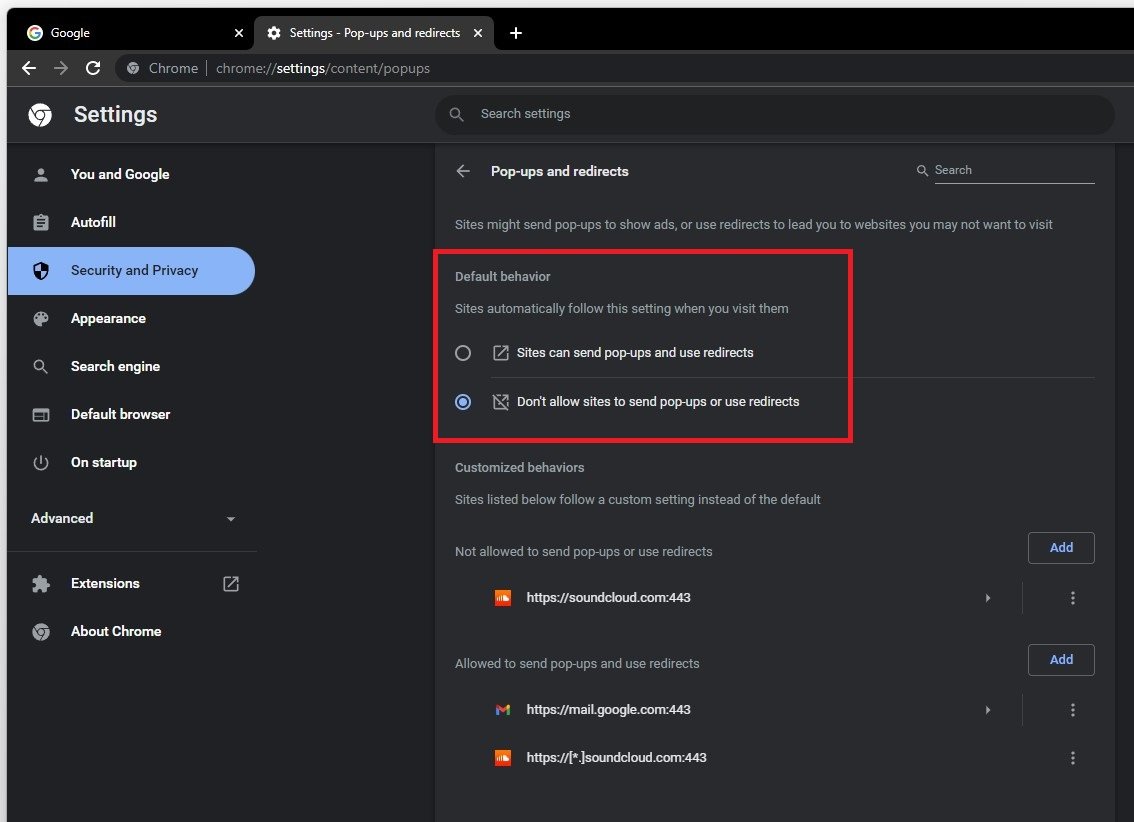 在下面彈出窗口和重定向,您可以更改所有網站的默認彈出窗口設置。下面,您可以訪問網站的定制行為您允許發送彈出窗口或已被阻止的窗口。