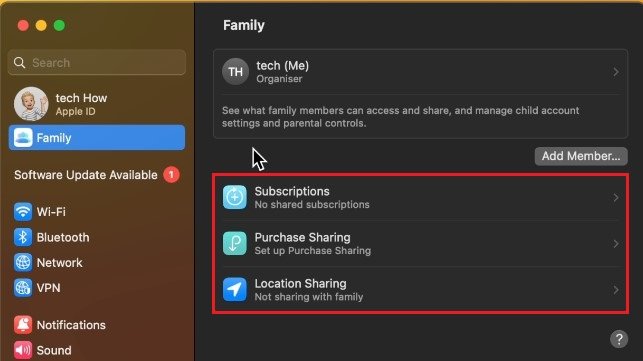 點擊設定旁邊家庭共享。這將允許您為連接到您的 Apple ID 的所有設備設置屏幕時間和內容限制。設置家庭帳戶時,您可以邀請其他用戶成為您的孩子或家庭其他成員。這還允許您共享有效的訂閱或設備的位置。