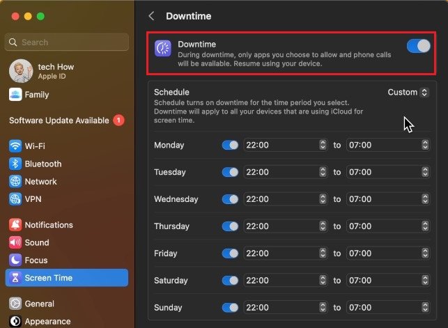 回到你的屏幕時間設置,確保屏幕時間已啟用。下面,您可以選擇啟用停機時間在您的設備上。停機時間僅允許一組應用程序在啟用時進行選擇。在下面設置自定義時間表。