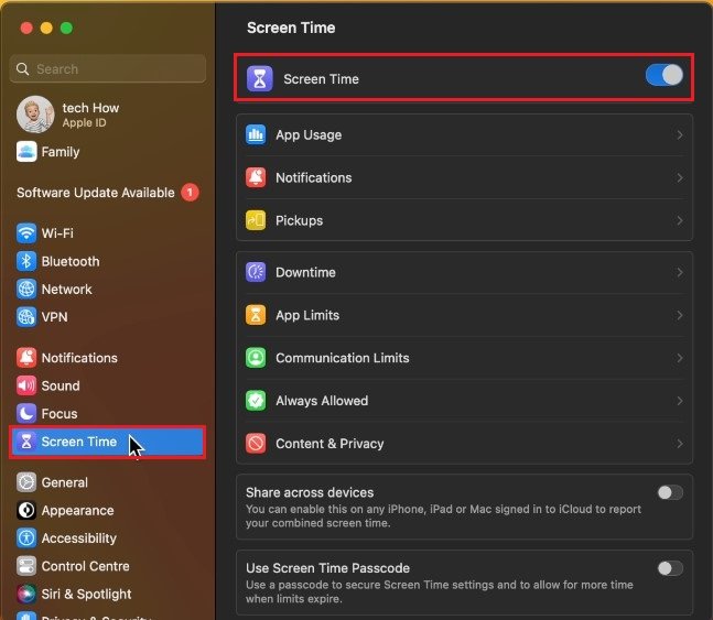 首先,在使用 Mac 時,單擊屏幕左上角的 Apple 圖標,然後選擇系統設置。如果您的設置在 Mac 上看起來有點不同,請確保您運行的是最新的 macOS 版本。接下來,在您的設置中,導航至屏幕時間部分。