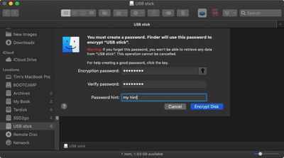 當您選擇加密,Finder 將提示您創建密碼,下次將 USB 閃存驅動器連接到 Mac 時需要輸入該密碼。 (不要忘記這一點,否則您將無法訪問 USB 驅動器上存儲的任何數據!)選擇密碼後,驗證它,根據需要添加有意義的提示,然後單擊加密磁盤。