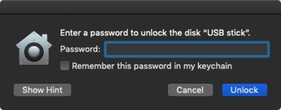 請注意,該提示包含 macOS 的一個選項在我的鑰匙串中記住這個密碼。選中此框後,每當您再次將 USB 記憶棒連接到 Mac 時,系統都不會提示您輸入密碼,並且您將可以自動訪問它,就像任何其他驅動器一樣。