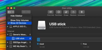 - 通過單擊其頂級設備名稱(即不是其下方列出的捲名稱),在側欄中選擇您的 USB 閃存驅動器。