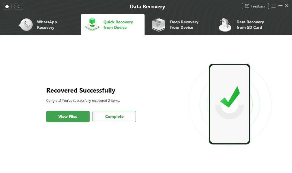步驟1。 啟動 DroidKit > 將鼠標移至 數據恢復然後單擊 從設備快速恢復。在快速恢復模式下,DroidKit還為您提供深度恢復模式以獲得恢復數據的最高權限。
