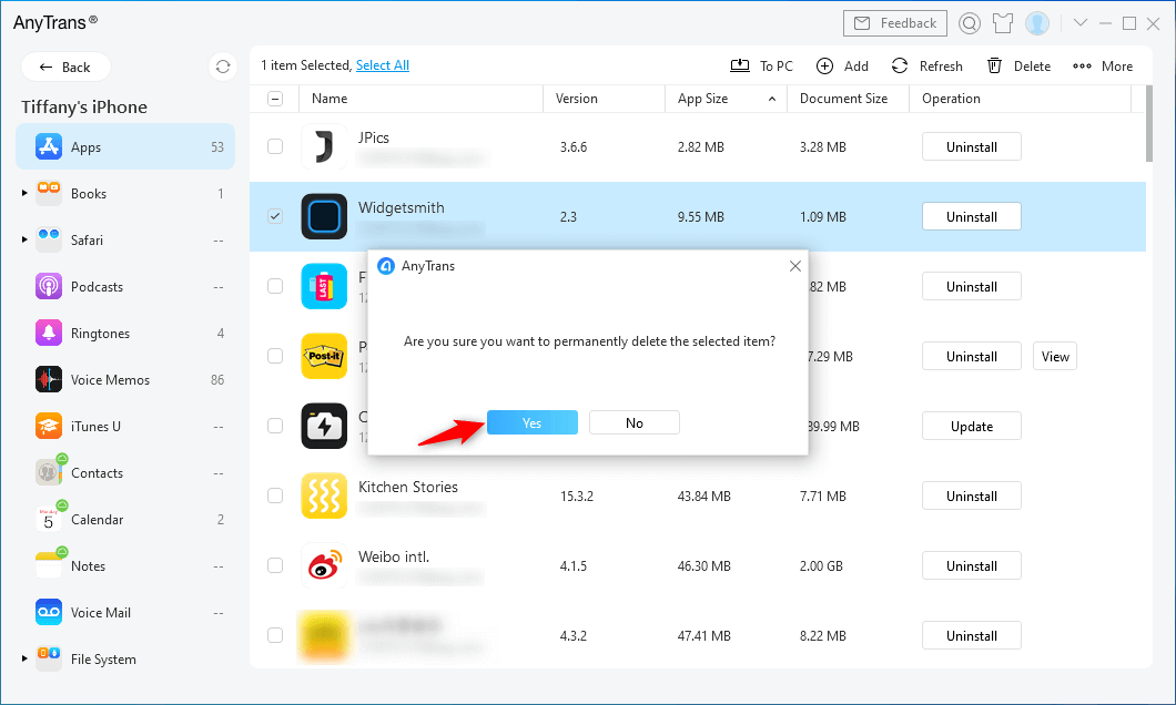 然後 AnyTrans 會彈出窗口讓您確認是否永久刪除所選應用程序 > 單擊“是”永久刪除該應用程序。
