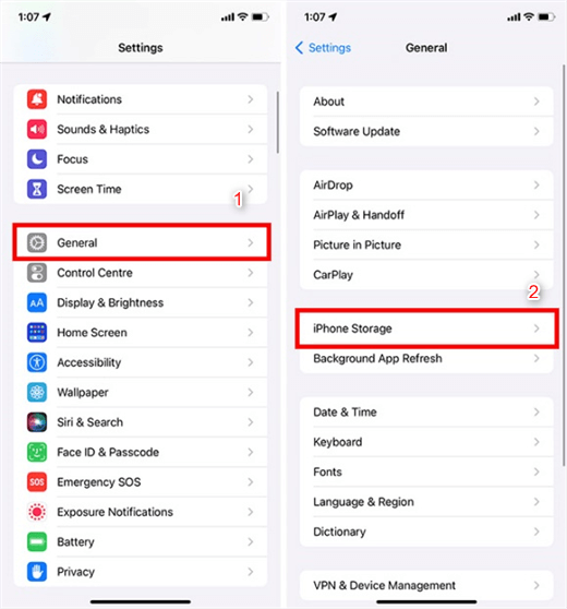 步驟 1. 前往“設置”,然後選擇“常規”並選擇“iPhone 存儲”選項。
