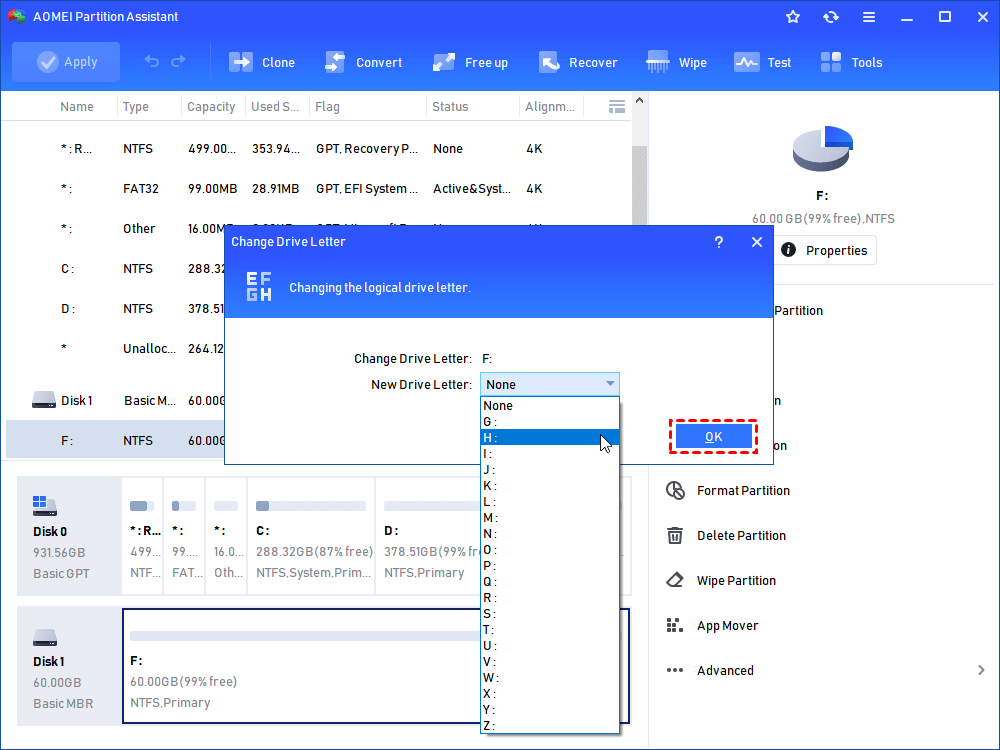 步驟1。啟動IEMOA分區助手,它會在主界面中顯示所有存儲設備。如果要為驅動器分配驅動器盤符,這裡需要右鍵單擊它並選擇先進的>更改驅動器盤符。