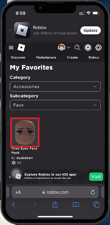 如果您忘記了該物品的名稱,您可以在 Roblox 應用程序中“收藏”感興趣的物品,以便以後輕鬆訪問。然後,通過網絡瀏覽器使用 Roblox 網站上的“收藏夾”部分查找該項目及其 ID。