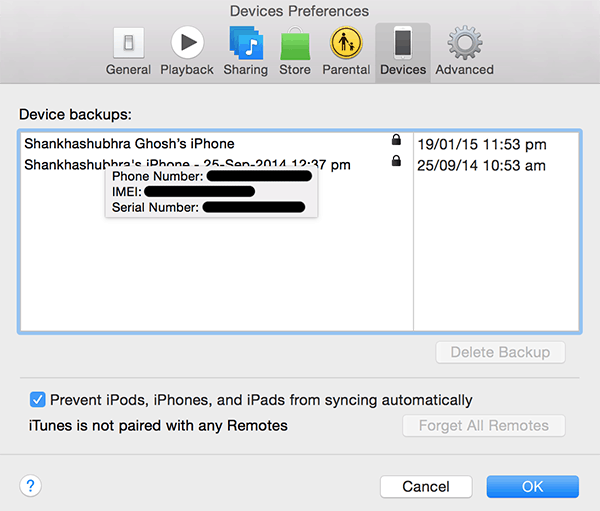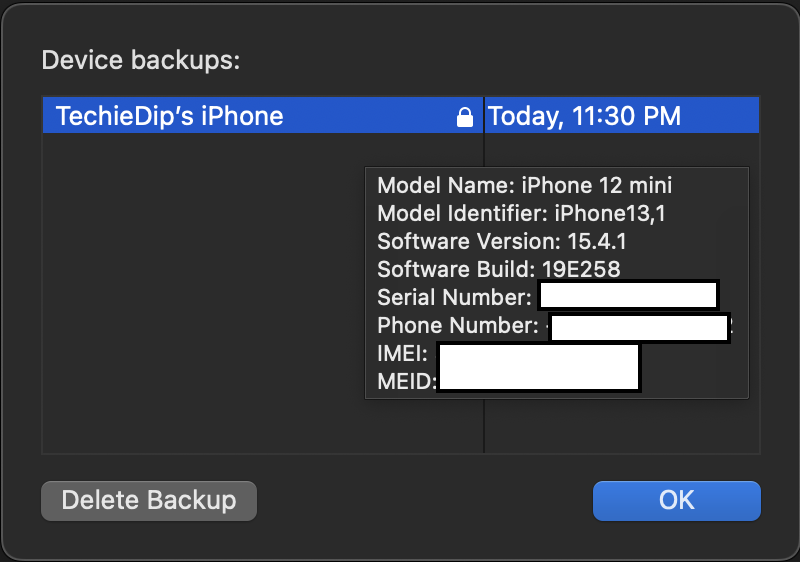 - 懸停在丟失的iPhone的現有備份中,以揭示其IMEI號碼。
