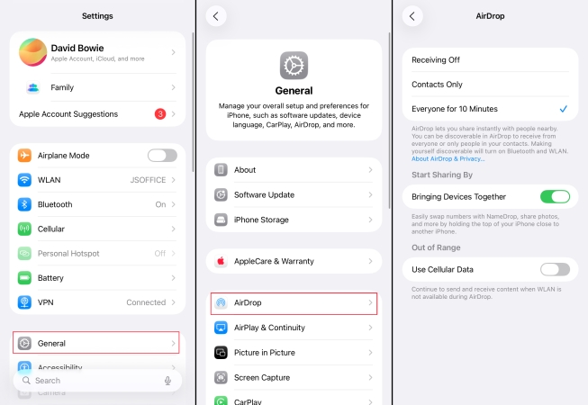 步驟1。轉到 iPhone設置 > 常規 > 空投。