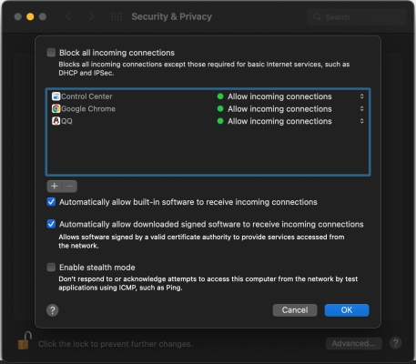 Mac 的防火牆或第三方安全軟件可能會阻止入站連接,從而影響 AirDrop 發現或文件接收。