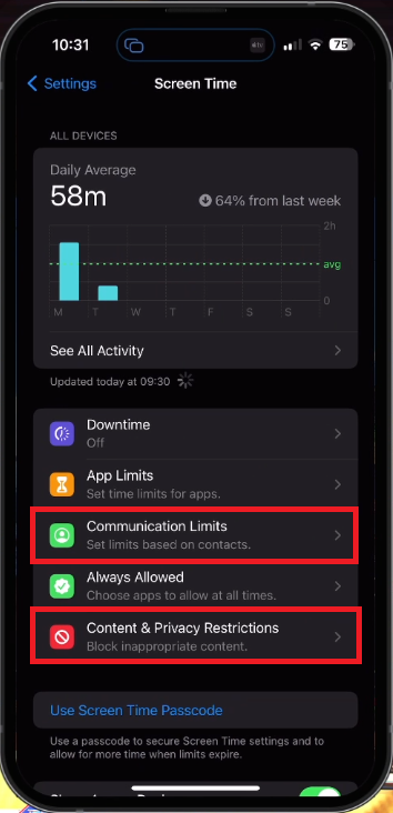 然後您可以嘗試通過空投發送文件。如果問題仍然存在,請返回設備設置。在屏幕時間部分,確保您的設備上禁用了通信限制以及內容和隱私限制。選擇內容和隱私限制。您可以完全禁用這些限制,看看這是否解決了您面臨的空投無法工作的問題