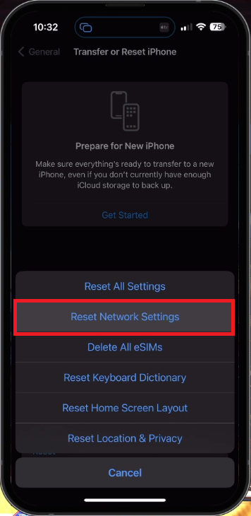 最後,如果沒有任何幫助,建議您重置網絡設置。在你的屬l 設置,向下滾動並點擊“傳輸”或“重置 iPhone”。接下來,選擇重置,然後重置網絡設置。這會將您的 WiFi、藍牙和其他一些設置重置為默認值,並且應該可以解決您遇到的任何空投問題。