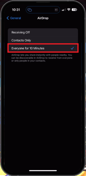 使用 iOS 設備時,打開設置應用程序。導航至“常規”部分並選擇“空投”。確保空投不限於發件人和收件人設備上的僅限聯繫人。此選項是空投問題最常見的罪魁禍首。