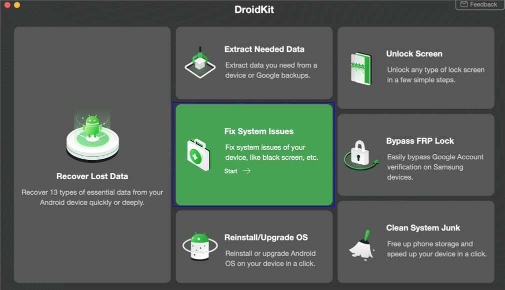步驟1。您可以首先在計算機上打開 DroidKit 並單擊修復系統問題在主屏幕的中間。