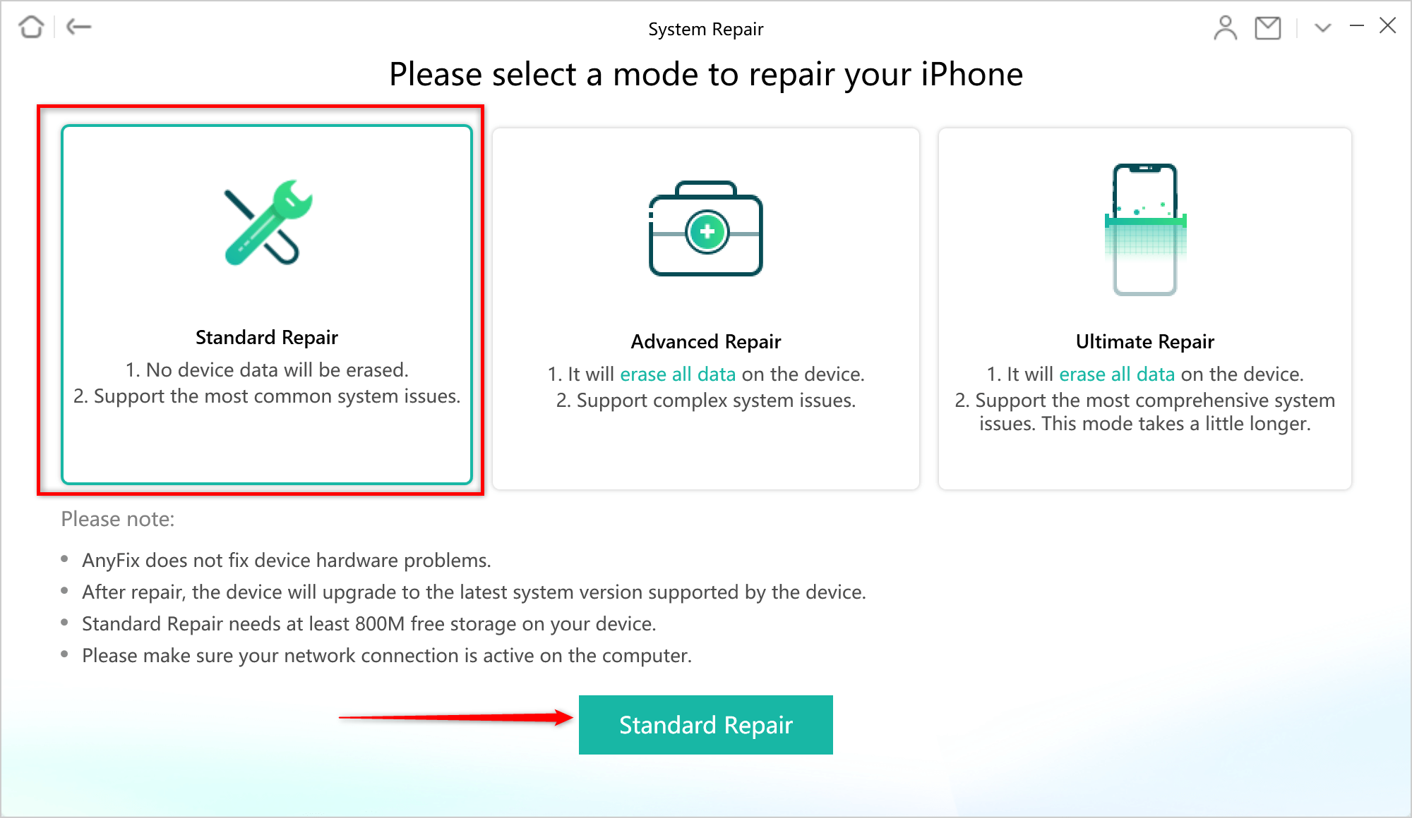步驟3.您可以選擇最適合您的Apple TV的維修模式。在這裡我們推薦的是標準維修這不會有任何數據丟失的風險。