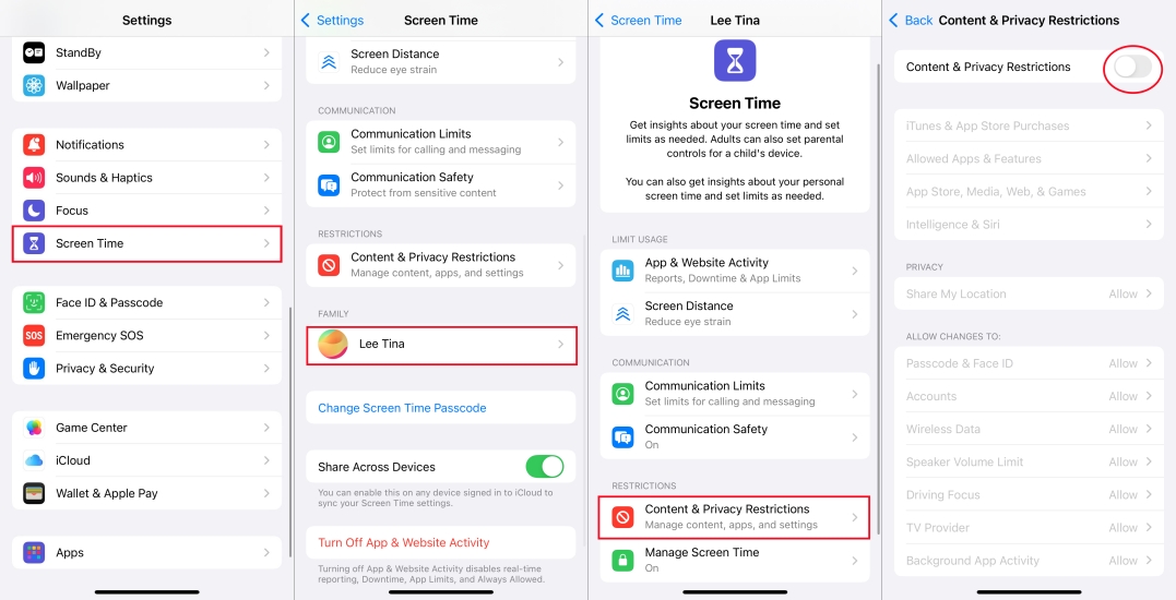 步驟1。輕敲設置 > 屏幕時間,然後點擊“家庭”下您孩子的名字。