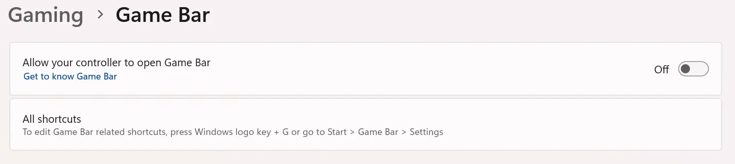 Xbox 遊戲欄:Windows + I → 遊戲 → Xbox 遊戲欄 → 關閉