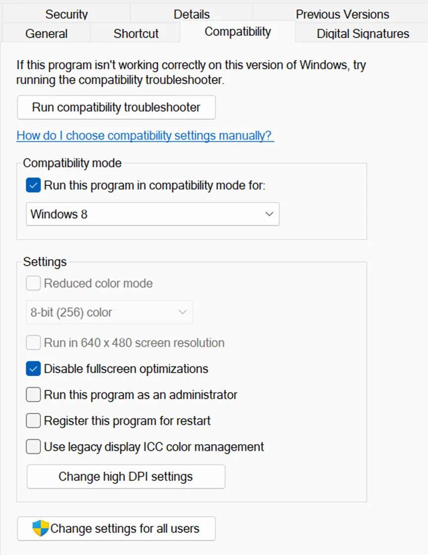 3. 禁用全屏優化(右鍵單擊遊戲.exe → 屬性 → 兼容性)。