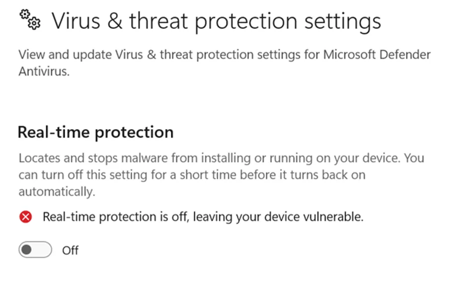 6. 關閉實時保護。您可能會收到警告,但請確認您想要將其關閉。這將暫時禁用 Windows Defender 的實時掃描。
