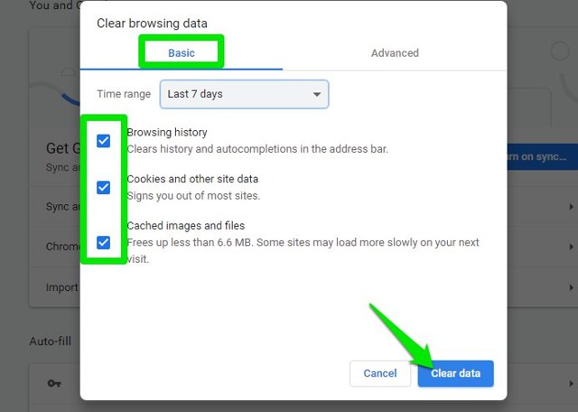 按鍵盤上的 Ctrl+Shift+Delete 按鈕打開“清除瀏覽數據”窗戶。在這裡選擇擴展安裝之前的時間範圍,並確保下面的所有選項“基本的”選項卡被選中。然後,單擊“清除數據”刪除所有數據。