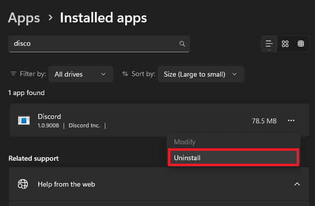 要重新安裝 Discord,請首先通過“設置”>“應用程序”將其卸載。然後,從 Discord 官方網站下載最新版本並運行安裝程序。
