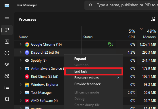 如果 Discord 在後台或系統托盤中運行,您可以通過右鍵單擊 Discord 圖標並選擇“退出 Discord”或“退出 Discord”來關閉它。如有必要,通過任務管理器結束所有延遲進程。
