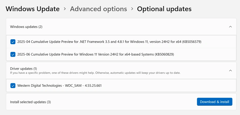 - 接下來,單擊“高級選項”,然後單擊“可選更新”。
