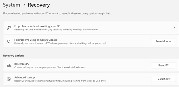 修復 PC 上的 DISM 主機服務進程高 CPU 錯誤的最後一種方法是重置 Windows 操作系統。以下是您可以如何做到這一點。儘管 Windows 提供了在重置期間保留數據的選項,但建議您在外部手動備份文件以防止任何潛在的數據丟失。