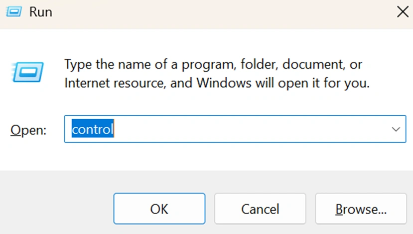 - 按 Win + R 啟動“運行”框,鍵入 Control,然後按“確定”按鈕。