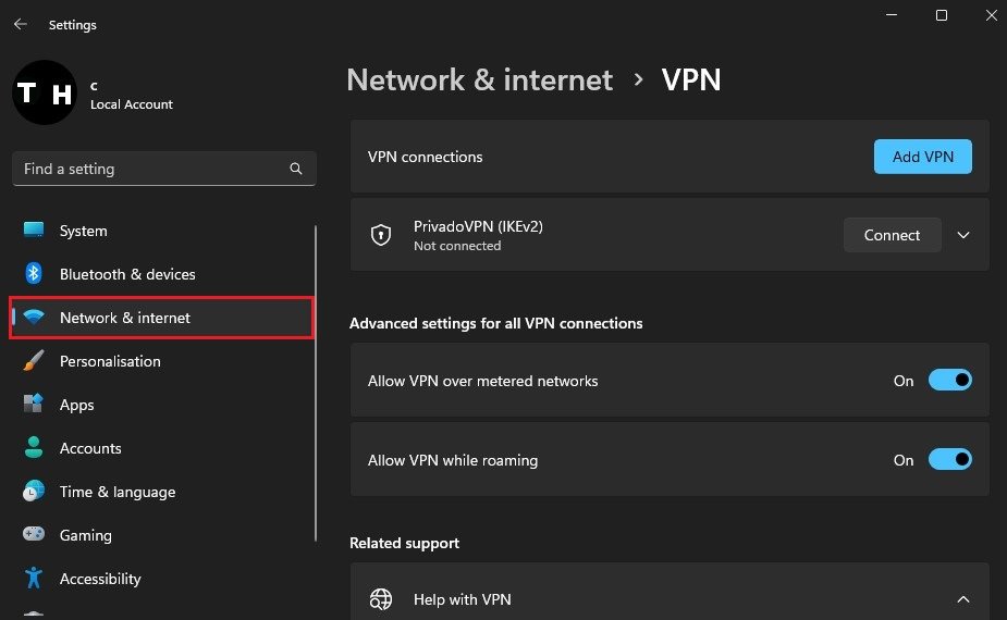 如果問題仍然存在,請打開 Windows 設置。在網絡與互聯網部分,導航至VPN。下載文件時請確保禁用 VPN 或代理連接。 VPN 可能很有用,並且會阻止您在 Google Chrome 瀏覽器中進行下載。
