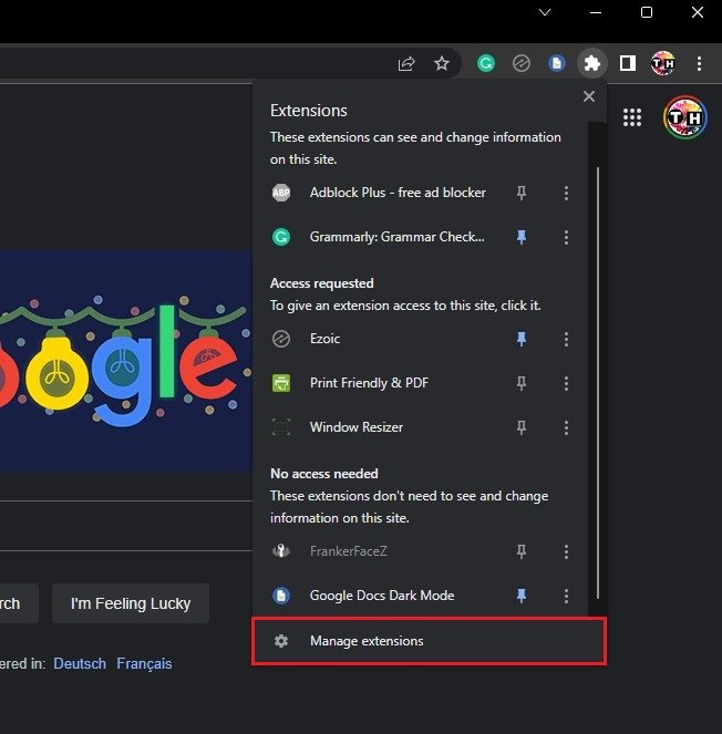 選擇擴展程序的圖標並單擊管理擴展。在此窗口中,禁用所有擴展程序並一一重新啟用它們,以查看導致下載問題的原因。