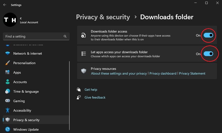 接下來,導航至隱私與安全在您的設置中。在這裡,向下滾動並單擊下載文件夾。確保下載文件夾訪問和讓應用程序訪問您的下載文件夾選項已啟用。