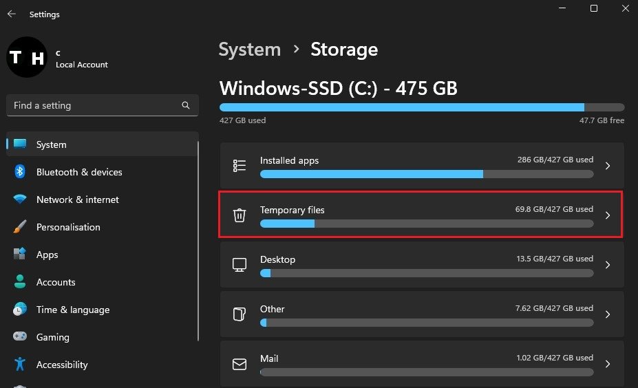 完成此操作後,您還應該確保有足夠的可用存儲空間用於下載。在你的系統設置,點擊貯存。加載您的存儲信息可能需要一秒鐘的時間,您可以查看是否還有足夠的空間。如果您的存儲空間幾乎已滿,您應該刪除臨時文件,包括回收站、以前的 Windows 版本以及您不再需要的其他文件。