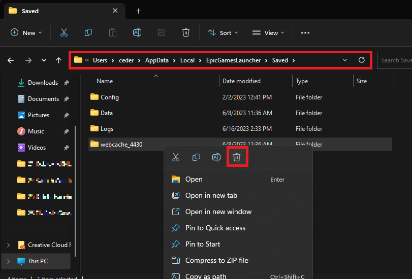 要糾正 Epic Games“IS-0003”錯誤,消除 Webcache 文件夾是下一個關鍵步驟。首先,請使用開始菜單搜索來查找“%本地應用程序數據%',然後按 Enter 鍵。此操作將打開您的文件資源管理器。在資源管理器窗口中,找到並訪問“Epic Games Launcher”文件夾。在此文件夾中,找到“已保存”文件夾並將其打開。在“已保存”文件夾中,找到“webcache”文件夾。在解決過程中刪除此文件夾至關重要。如果您在目錄中遇到“webcache_4147”和“webcache_4430”文件夾,請不要忘記刪除它們。