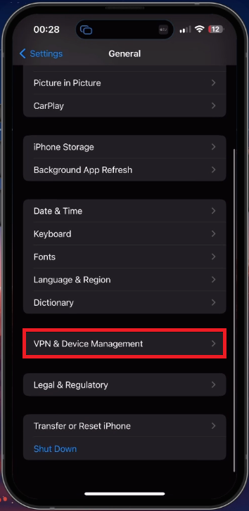 完成後,打開您的設備設置。在 iOS 設備上,導航至常規部分並點擊 VPN 和設備管理。確保在嘗試加載 Free Fire 或登錄您的帳戶時禁用任何 VPN 或代理連接。 VPN 很方便,但在嘗試玩遊戲時也會使您的連接狀況變差。