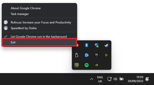首先,確保結束 PC 上仍在運行的所有 Google Chrome 進程。為此,請展開任務欄中的系統托盤。右鍵單擊 Chrome 圖標並選擇出口。這將確保您的 Chrome 瀏覽器未在您的系統上運行。